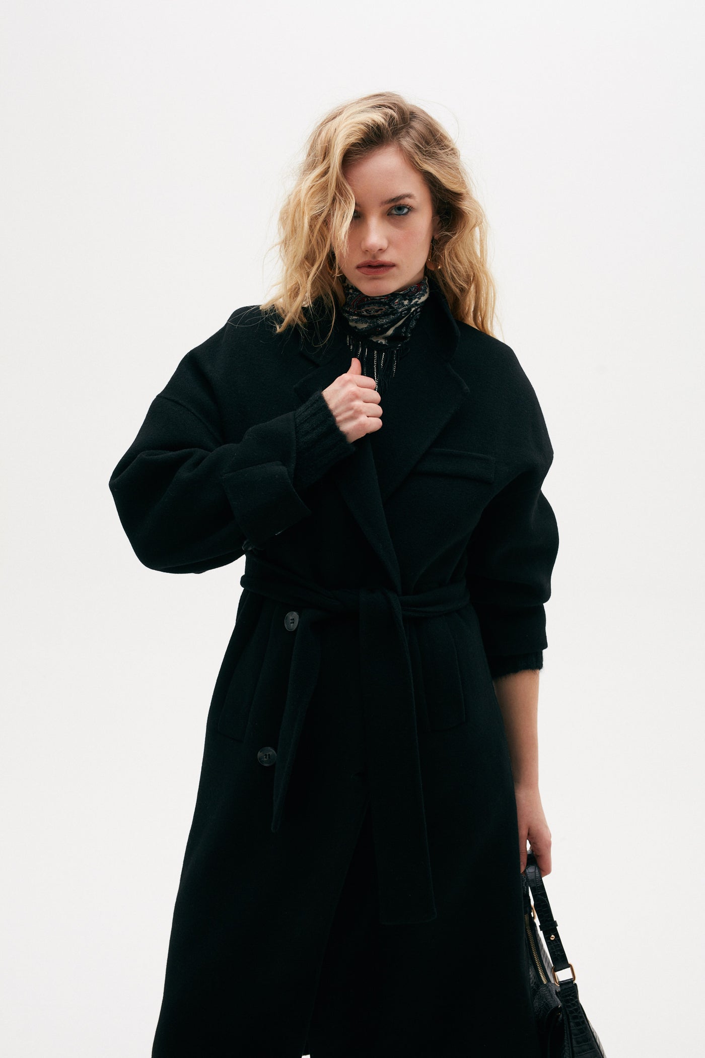 Abrigo largo de calce holgado y tejido grueso, con mangas largas y dos bolsillos. Presenta apertura frontal mediante botones. Interior sin forrería y acabado con costuras francesas.