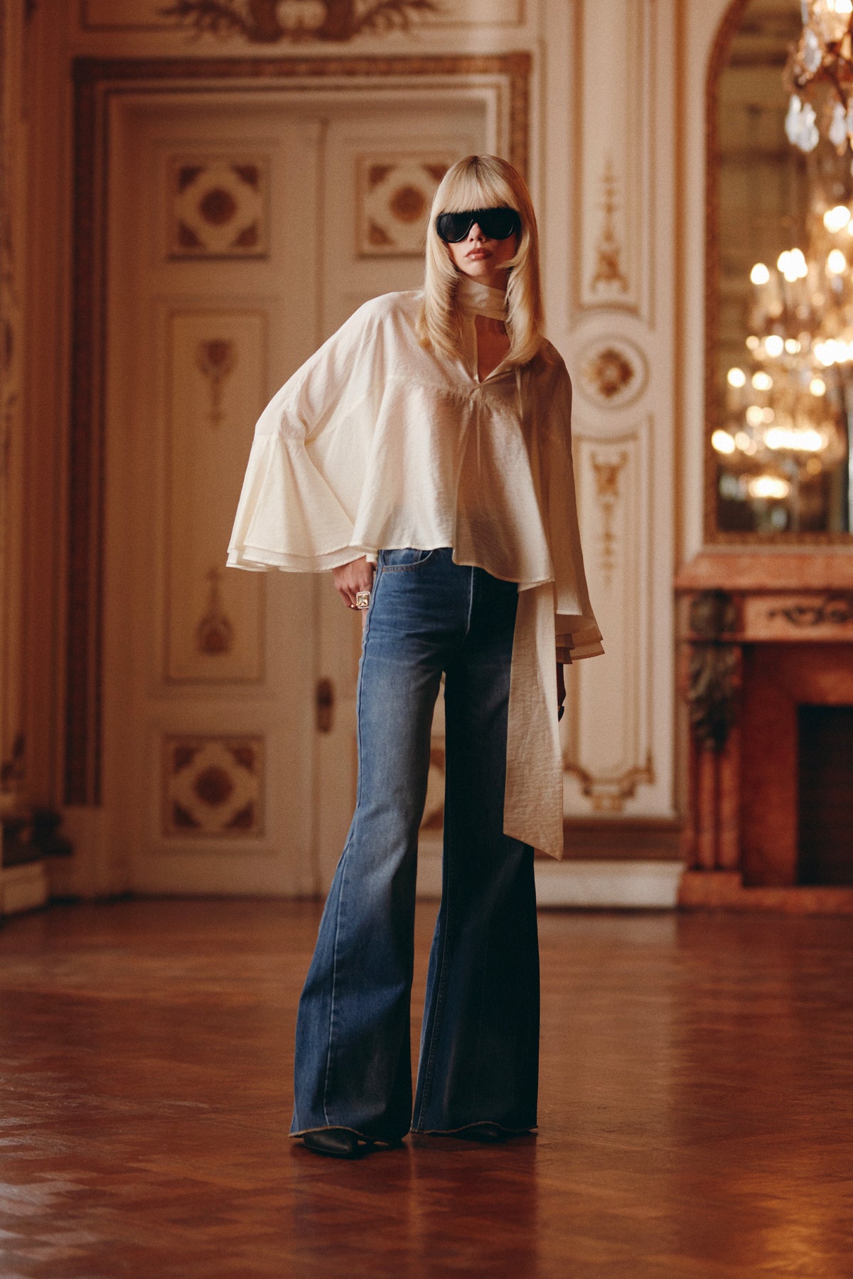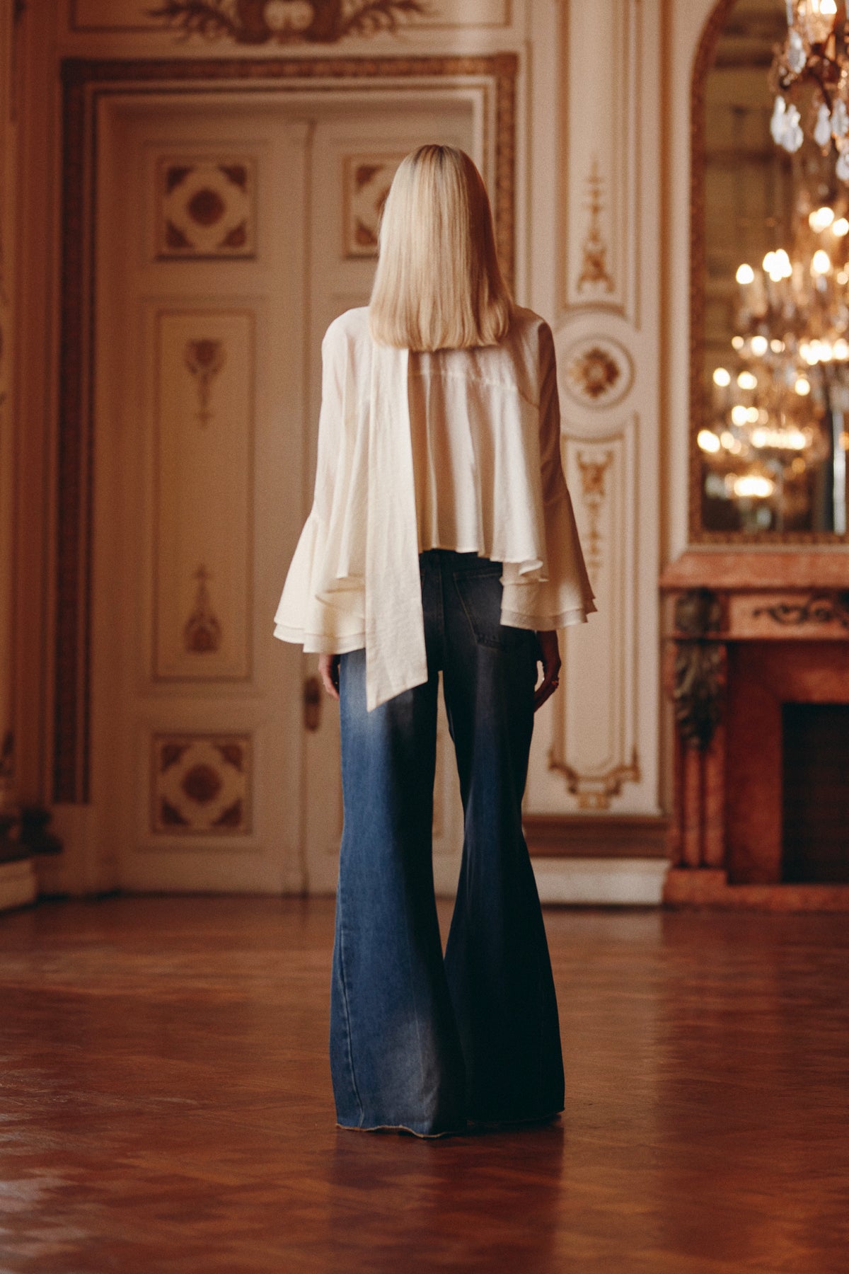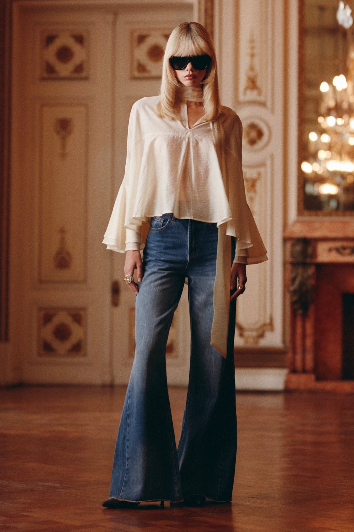 Blusa de estilo fluido y sofisticado en tono butter, confeccionada en una tela ligera que cae suavemente sobre el cuerpo. Presenta un diseño amplio y etéreo, con mangas tipo capa que aportan movimiento y una silueta relajada. El cuello alto con detalle tipo choker añade un aire elegante y moderno, mientras que el corte suelto refuerza su estética refinada y versátil. Ideal para lograr un look chic y femenino, fácilmente combinable tanto con prendas casuales como más formales.