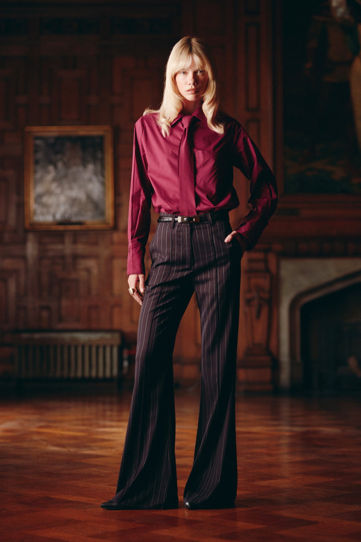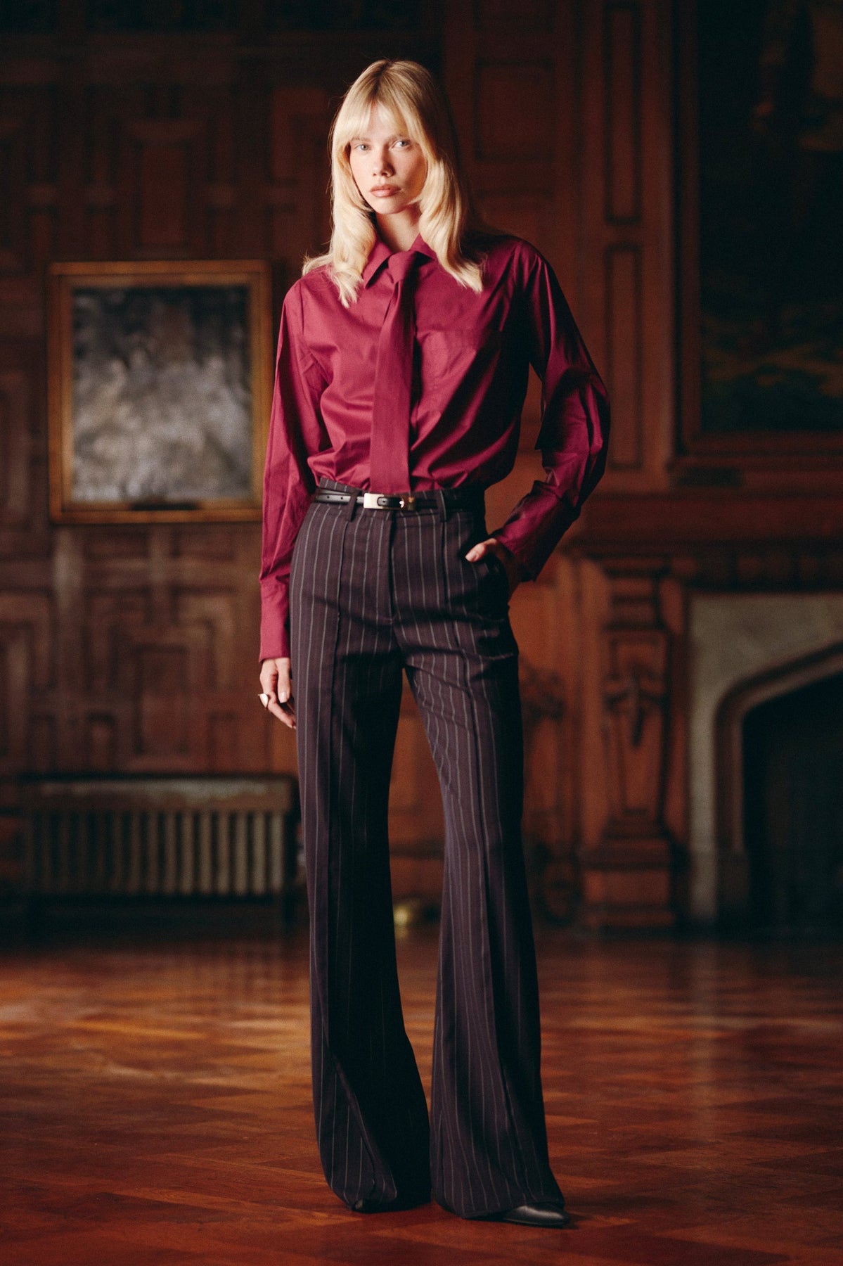 Pantalón sastrero con líneas diplomáticas, de calce ajustado y bota ancha. Incorpora alforzas centrales en ambas piernas que realzan la caída de la prenda, pretina interna personalizada en color blanco con logo y bajo terminado en vuelta. Presenta bolsillos laterales y posteriores tipo ojal, junto a un cierre frontal de cremallera y broche tipo corchete. La modelo mide 177 cm y viste talla 34.