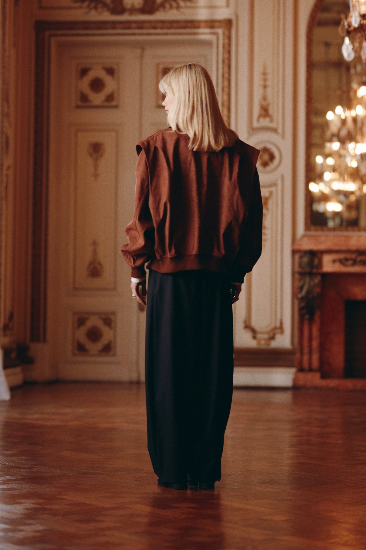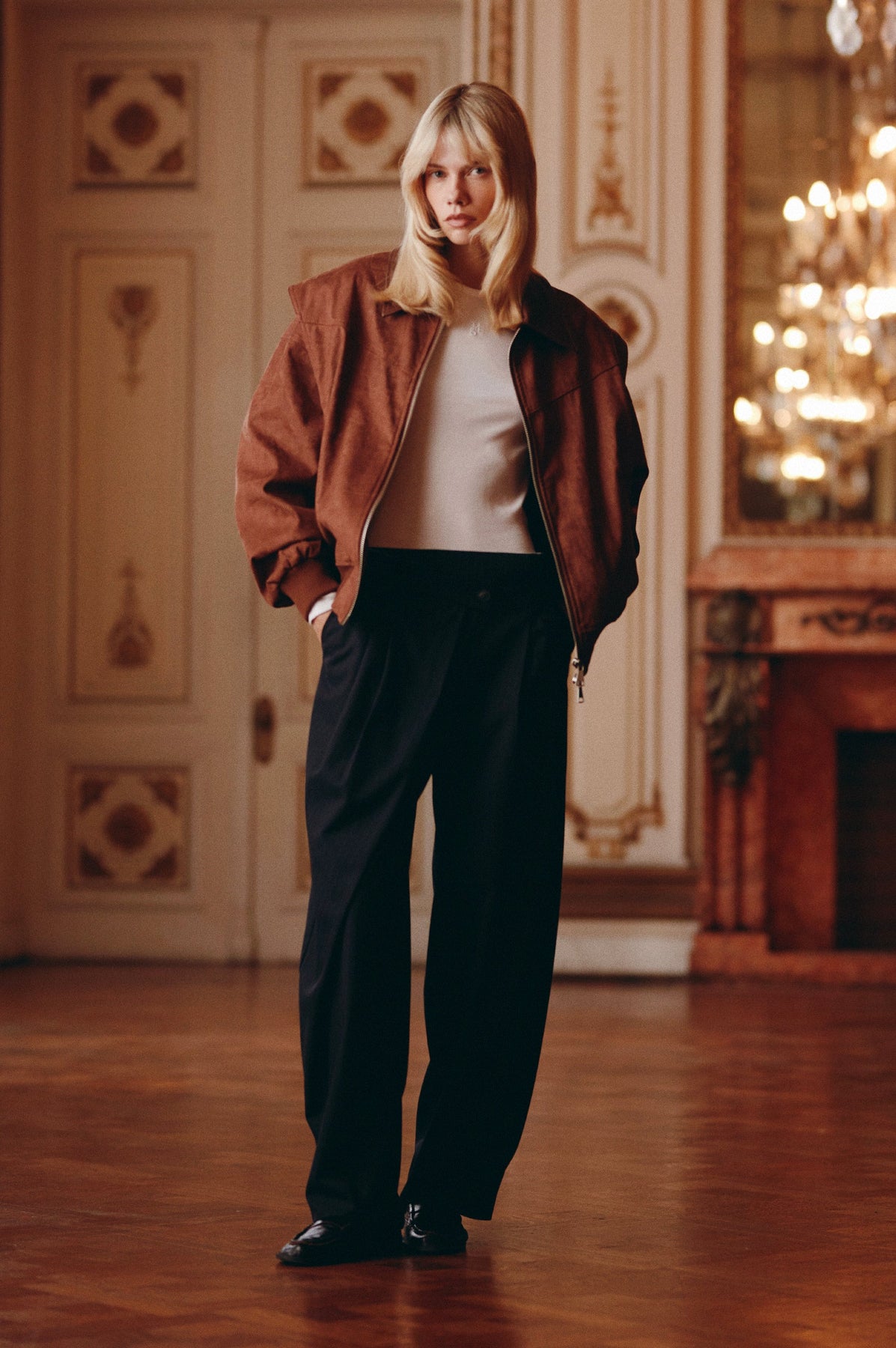 Pantalón sastrero de calce holgado confeccionado en tejido liviano. El diseño presenta un delantero de terminación irregular que aporta un detalle distintivo, bota ancha y bolsillos laterales funcionales. Cuenta con cierre frontal mediante cremallera y botón. La modelo mide 177 cm y viste talla 34.