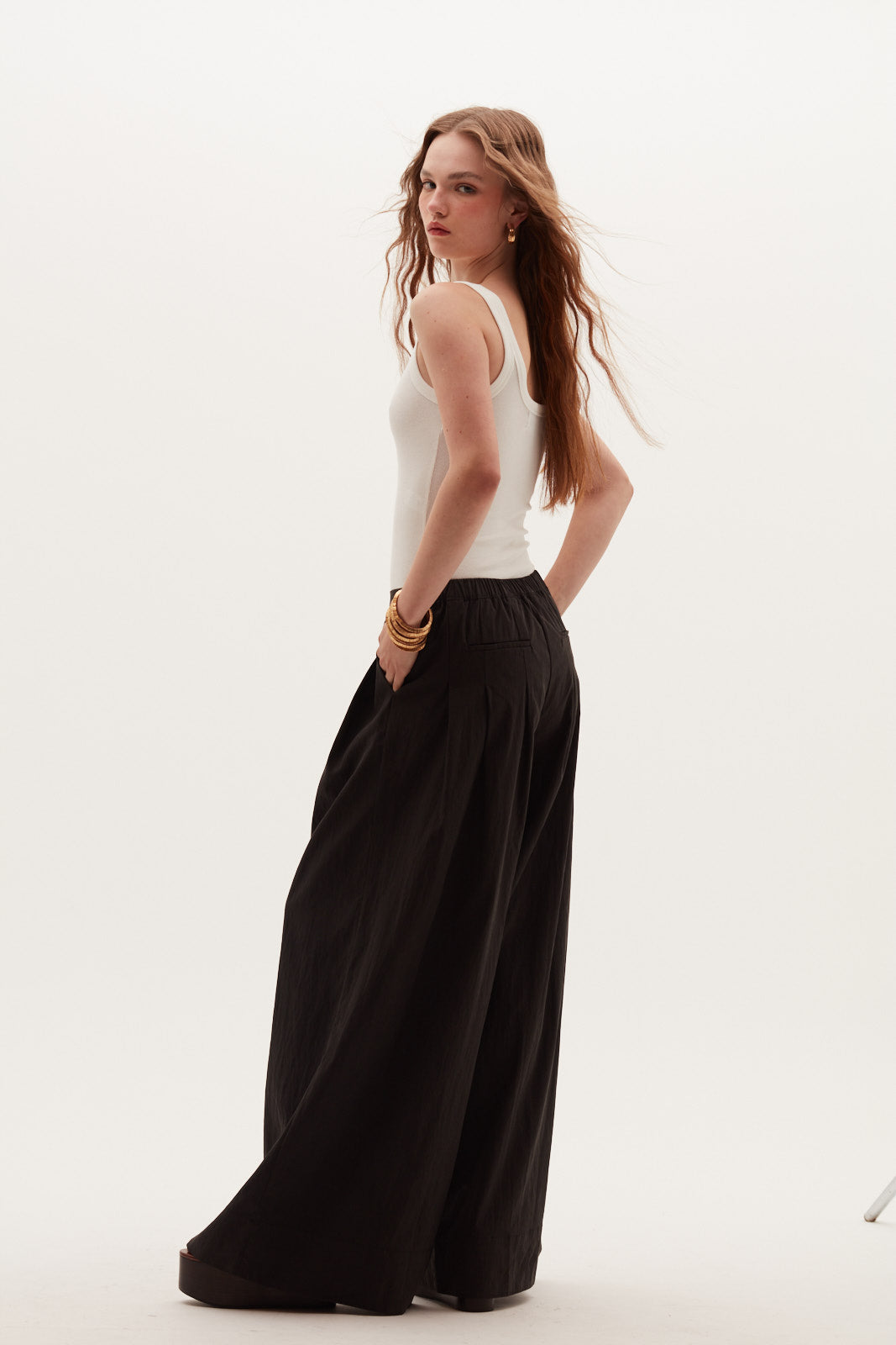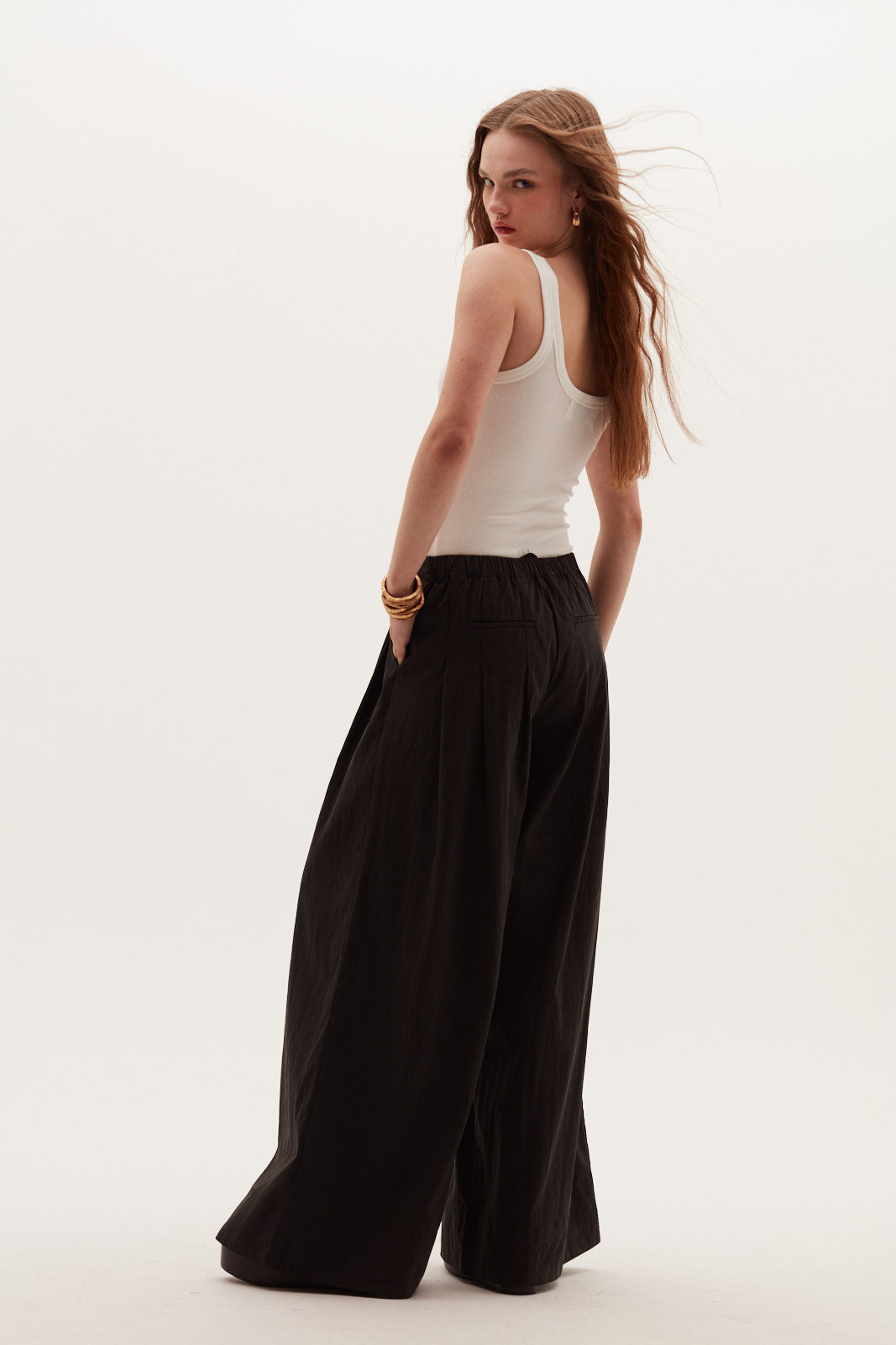 La modelo usa talla XS y mide 172 cm, proporcionando una referencia clara del calce. Un esencial moderno, cómodo y atemporal que no puede faltar en el clóset.