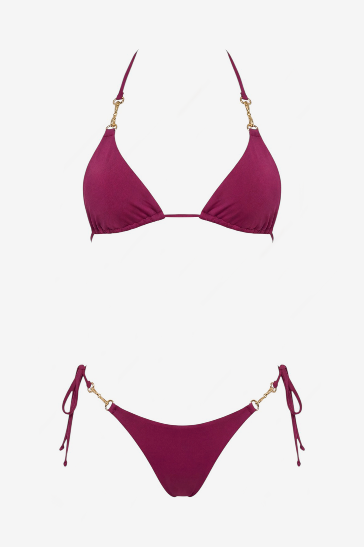 Este bikini de dos piezas presenta un top triángulo con relleno removible y un bottom de calce cheeky, regulable mediante lazos laterales.