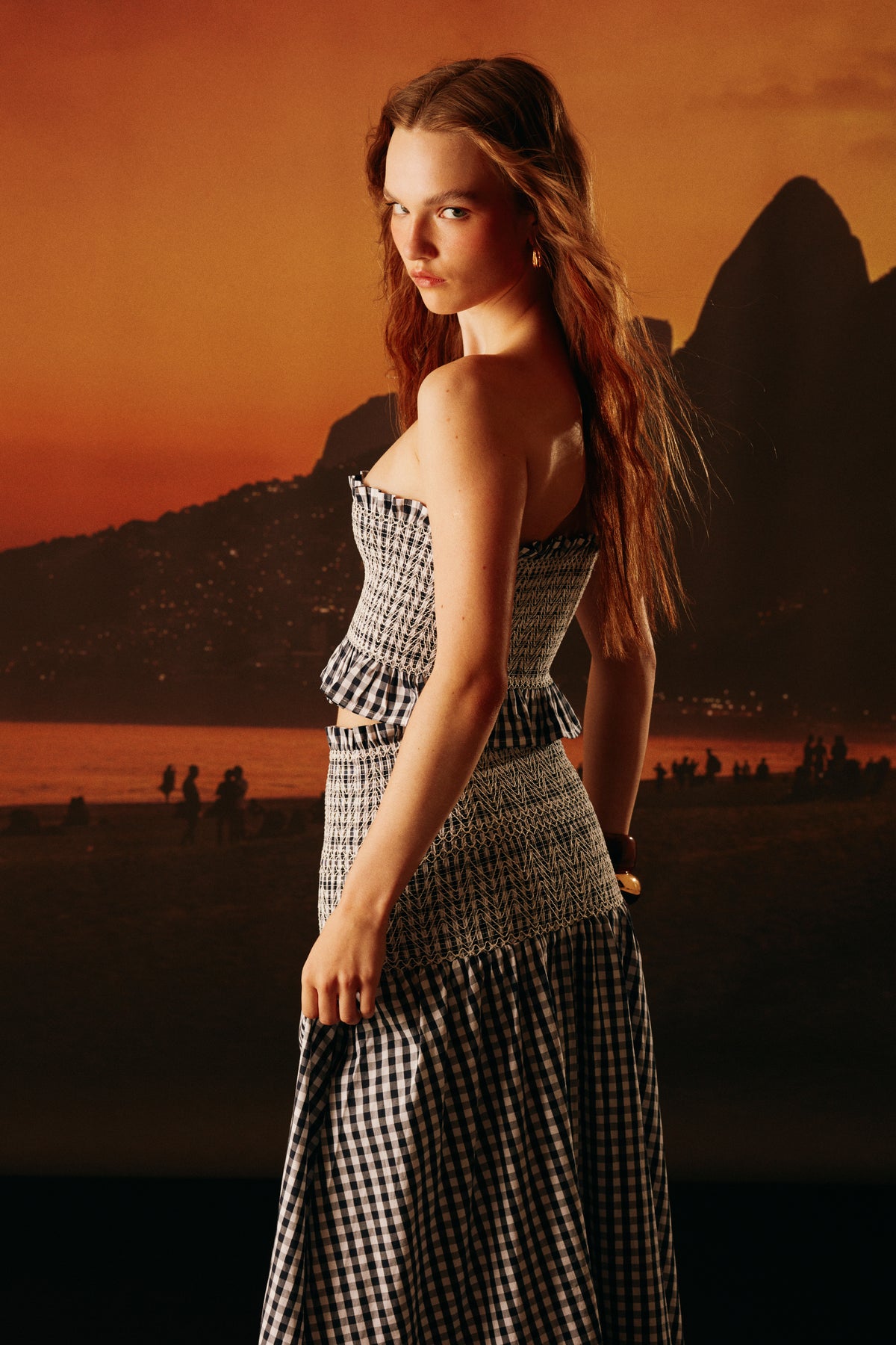 Esta falda larga de estampado Vichy aporta un aire fresco, femenino y atemporal a cualquier look. Confeccionada en 100% Cotton, ofrece una textura suave y ligera que acompaña el movimiento con naturalidad, perfecta para días cálidos o para crear conjuntos llenos de encanto.