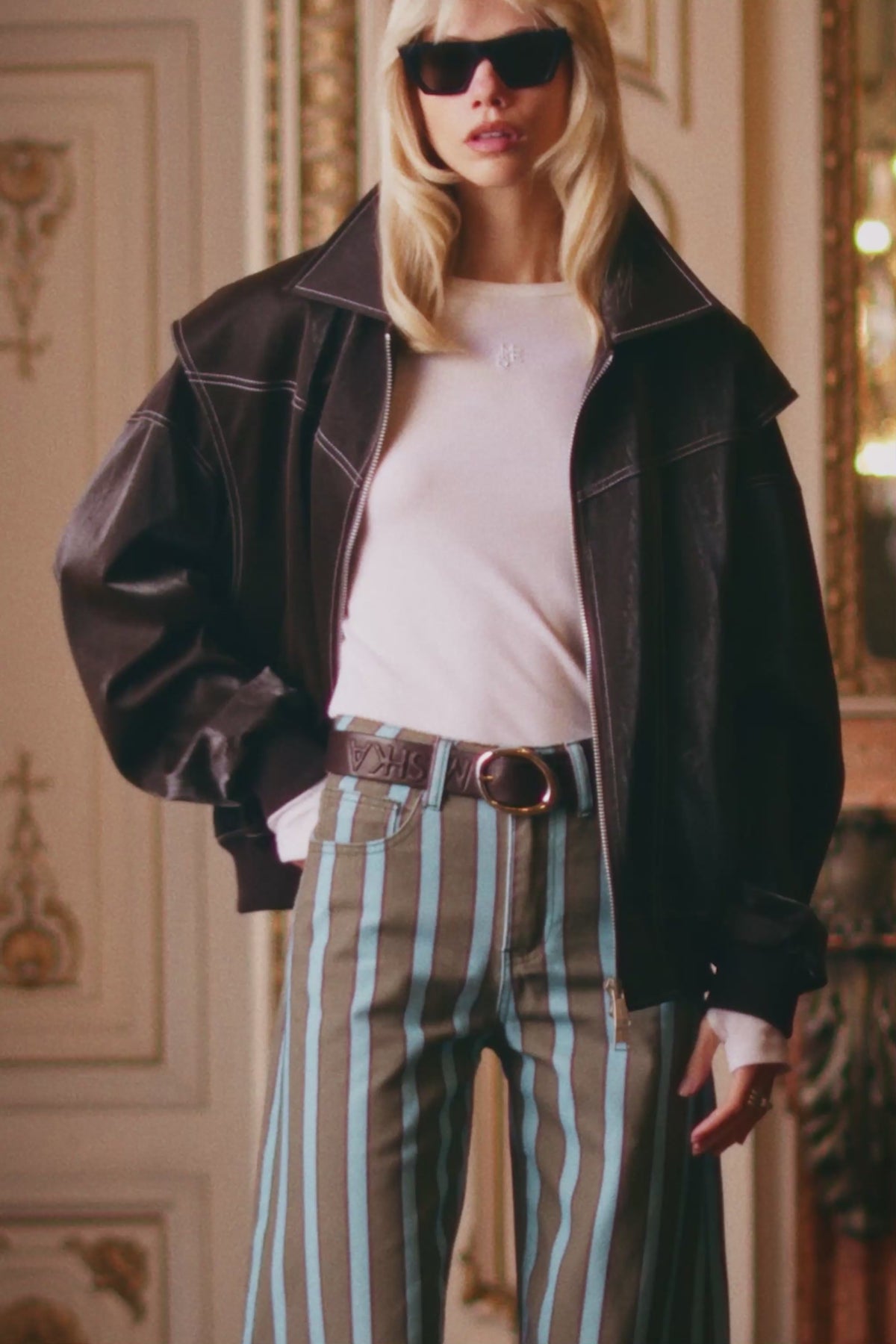Diseño de rayas verticales que estilizan la silueta, con tiro alto, cinco bolsillos funcionales, cierre frontal con botón metálico y pretina clásica. Su calce relajado lo hace una prenda versátil, ideal para looks urbanos o estilismos más elevados.
