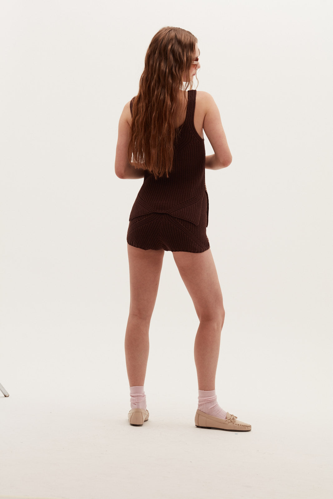 En la parte delantera, los apliques de hotfix añaden un destello sutil que realza la prenda sin perder su esencia minimalista. El cuello redondo y la manga sisa crean una silueta limpia y versátil, ideal para usar sola o en capas, adaptándose perfectamente a looks casuales, modernos o más pulidos.