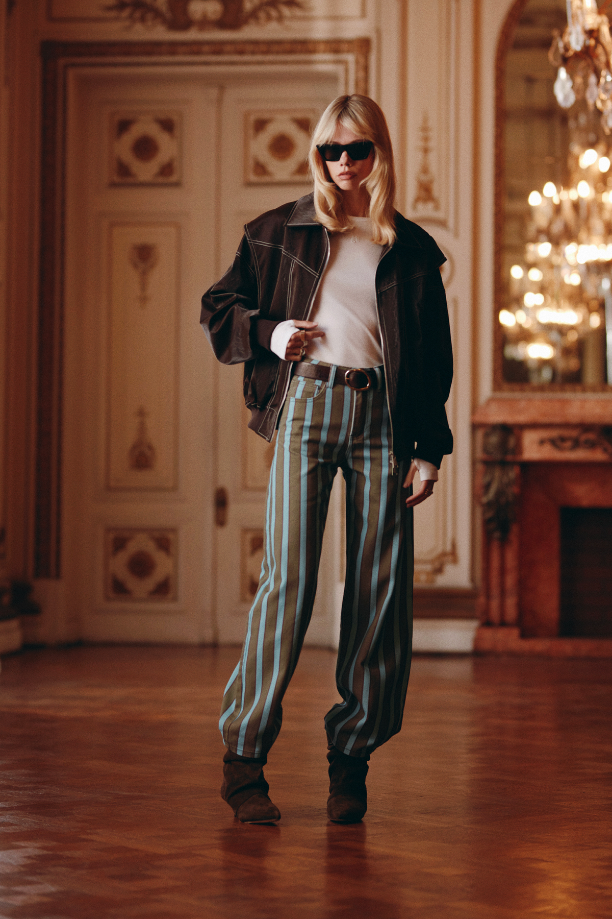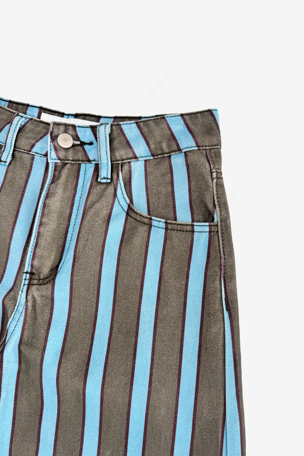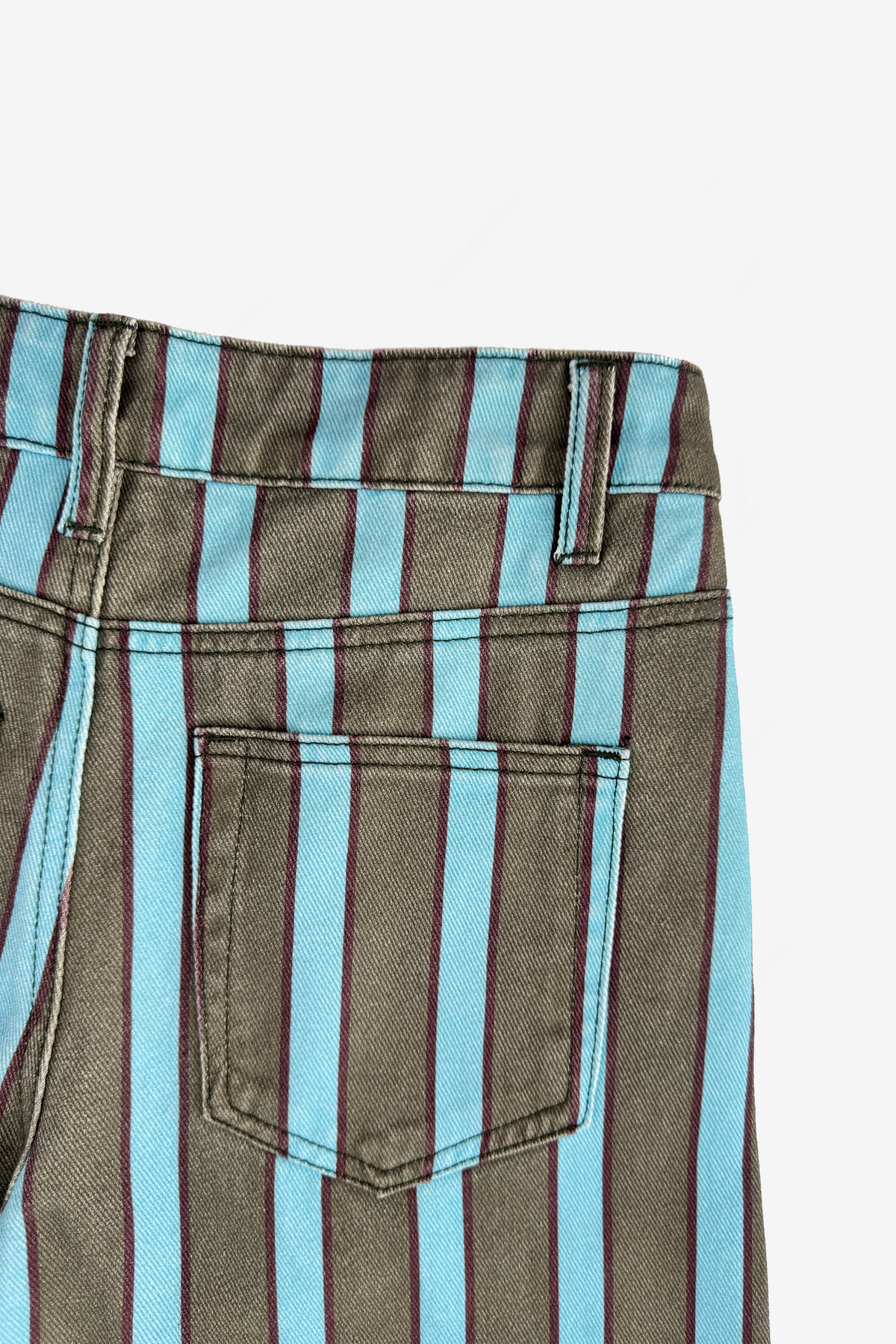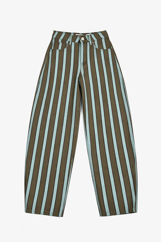 Diseño de rayas verticales que estilizan la silueta, con tiro alto, cinco bolsillos funcionales, cierre frontal con botón metálico y pretina clásica. Su calce relajado lo hace una prenda versátil, ideal para looks urbanos o estilismos más elevados.